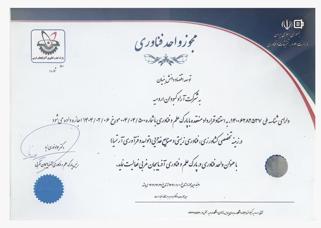 شرکت دانشبنیان آراد کبودان ارومیه با برند تجاری آرتمیا، افتخار دارد به عنوان پیشرو در عرصه تولید و فرآوری آرتمیا در کشور فعالیت نماید. تیمی متخصص و متعهد از پژوهشگران، کارشناسان زیستشناسی و مهندسین پرورش آبزیان در کنار امکانات پیشرفته، ما را قادر ساخته تا محصولاتی با کیفیت بالا را به بازار عرضه کنیم.